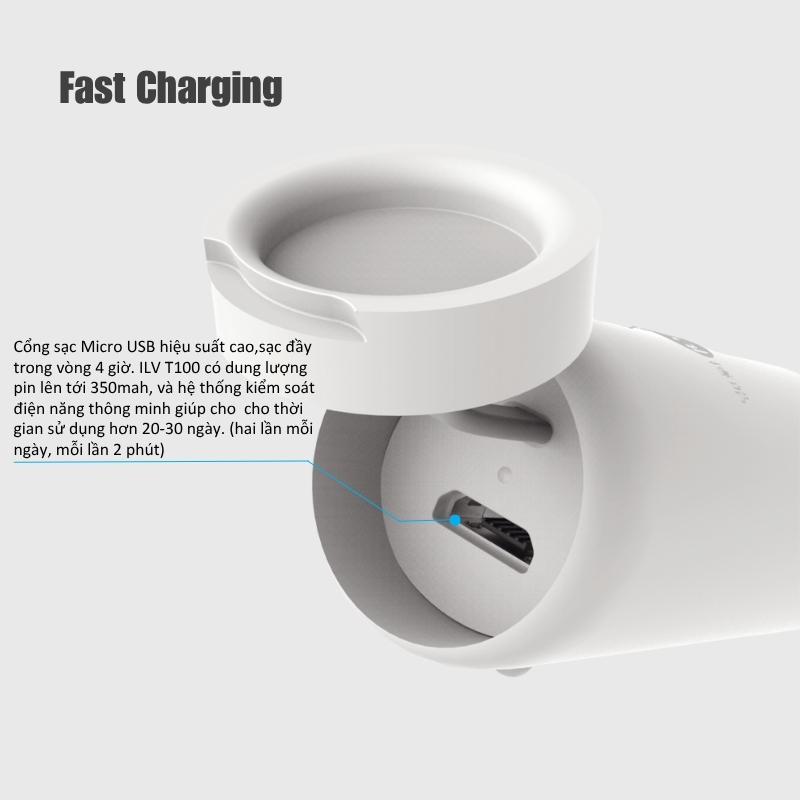 ILV T100 đạt chuẩn chống nước IPX7, cho phép người dùng rửa bàn chải dưới vòi nước một cách thoải mái mà không lo hỏng hóc.