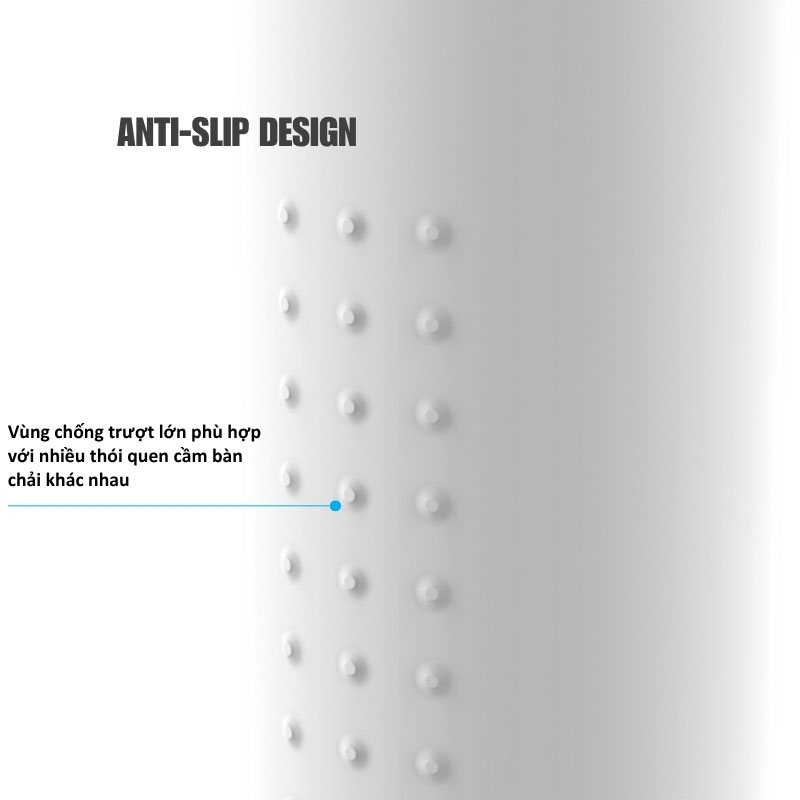 Thân bàn chải được thiết kế với các gân nhỏ li ti chống trơn trượt, giúp người dùng cầm nắm thoải mái và an toàn ngay cả khi tay ướt.