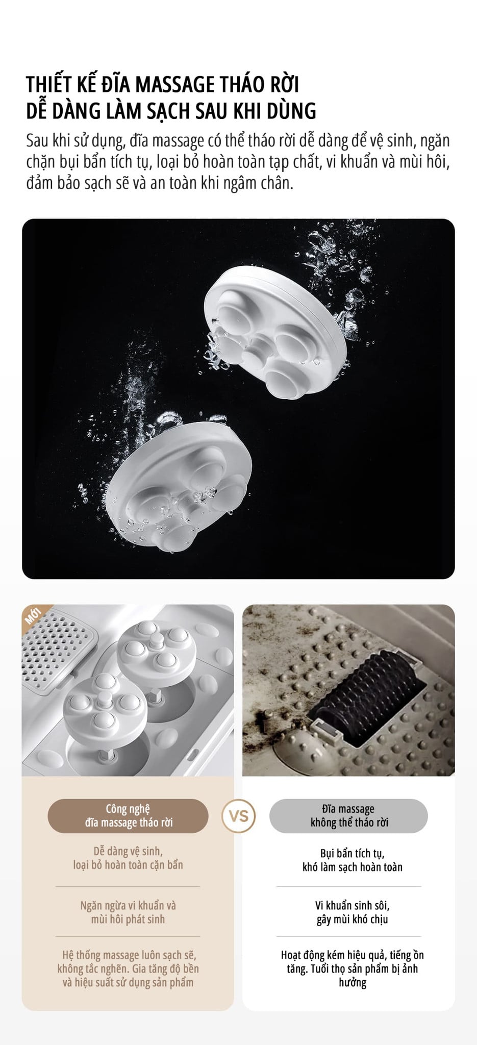 Đĩa massage có thể tháo rời, thuận tiện cho việc vệ sinh và đảm bảo sạch sẽ khi sử dụng lâu dài.