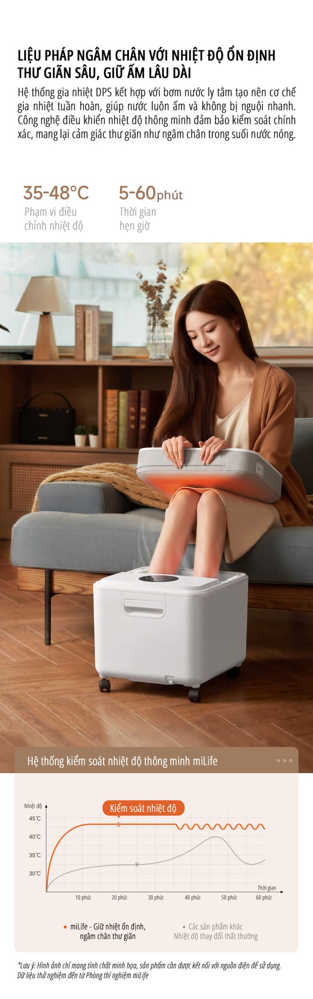Chức năng ngâm chân giữ nhiệt DPS cao cấp, duy trì nhiệt độ từ 35 đến 48 độ C và hỗ trợ hẹn giờ.