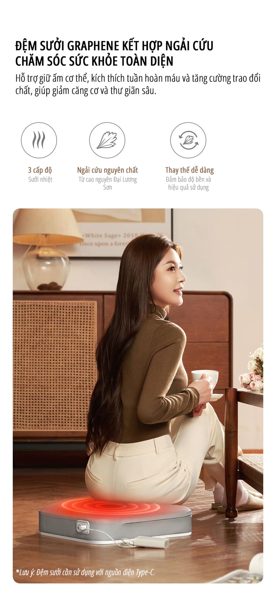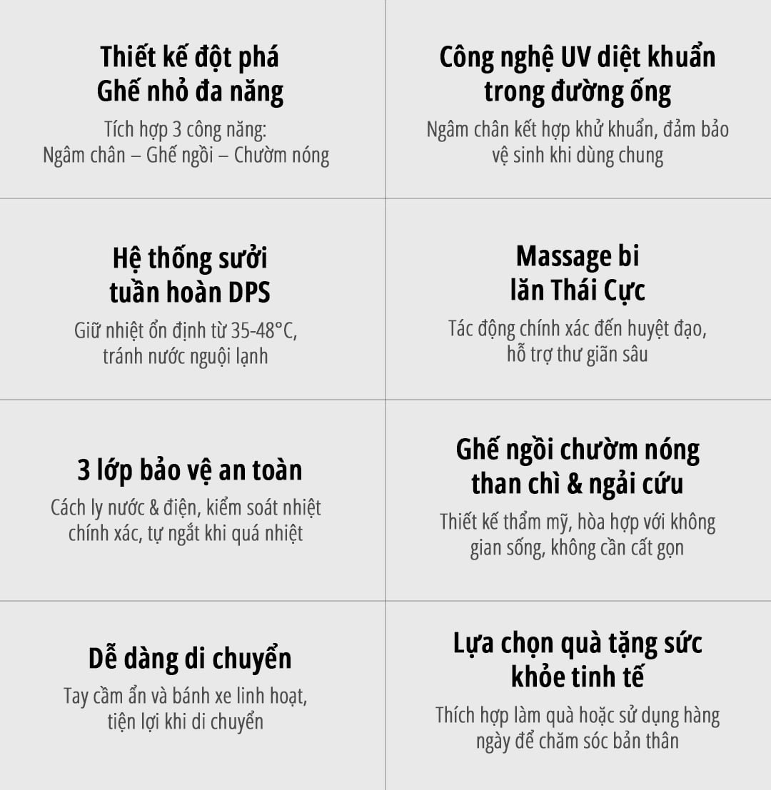 Thiết kế đa năng 3 trong 1, vừa dùng làm ghế đôn phát nhiệt, bồn ngâm chân giữ nhiệt, vừa massage bằng bi kết hợp chườm nóng ngải cứu.