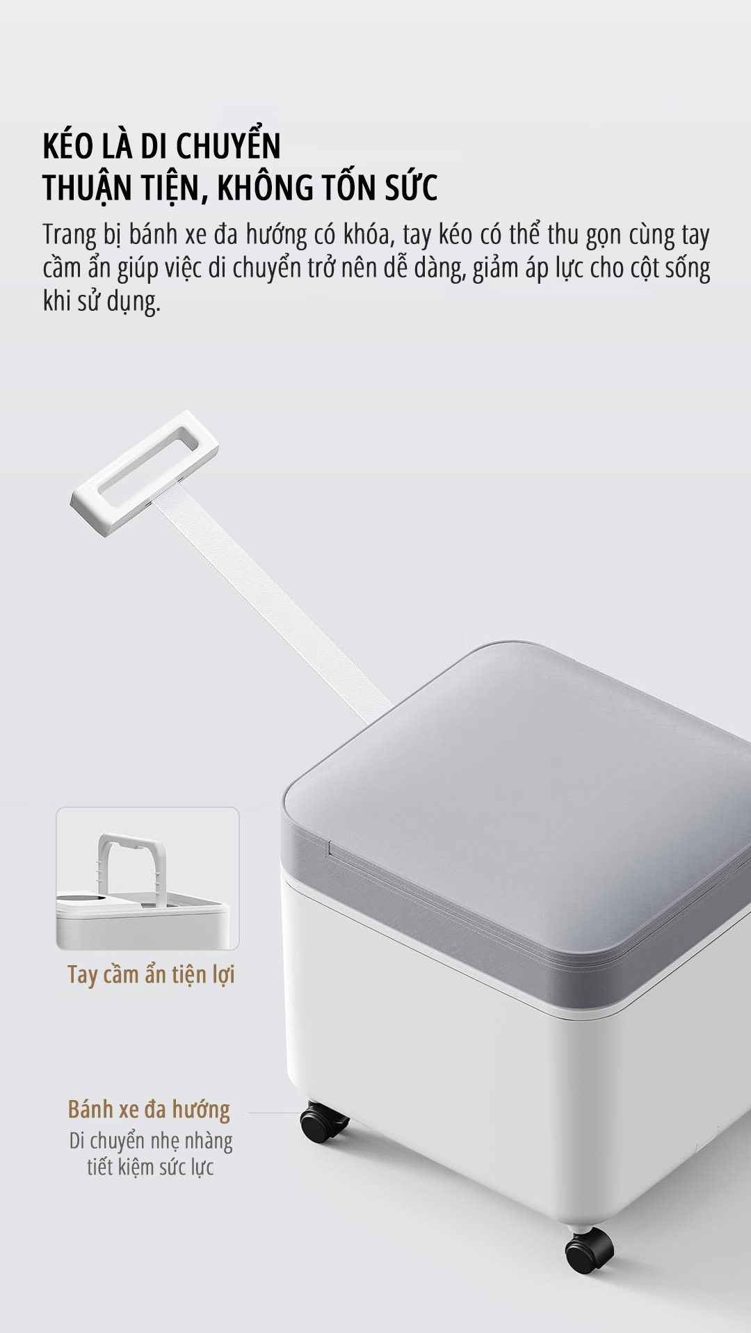 Trang bị dây kéo và bánh xe, giúp di chuyển dễ dàng và linh hoạt trong không gian gia đình.