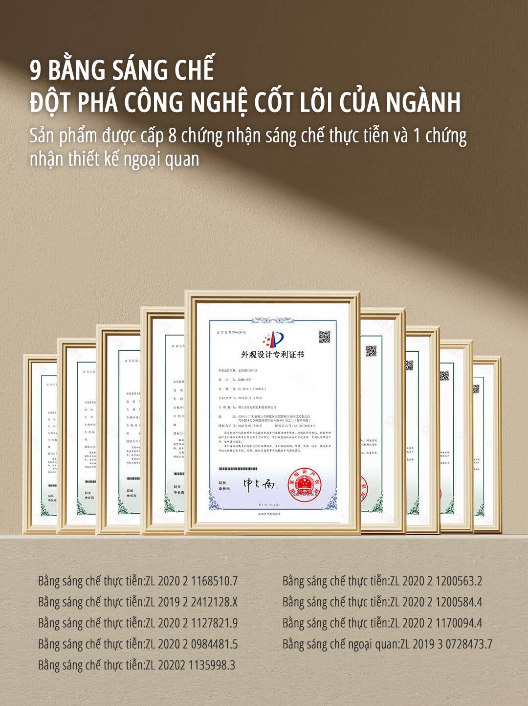 Sở hữu 9 bằng sáng chế và 8 chứng nhận uy tín, thể hiện đột phá công nghệ massage và độ an toàn trong chăm sóc sức khỏe.
