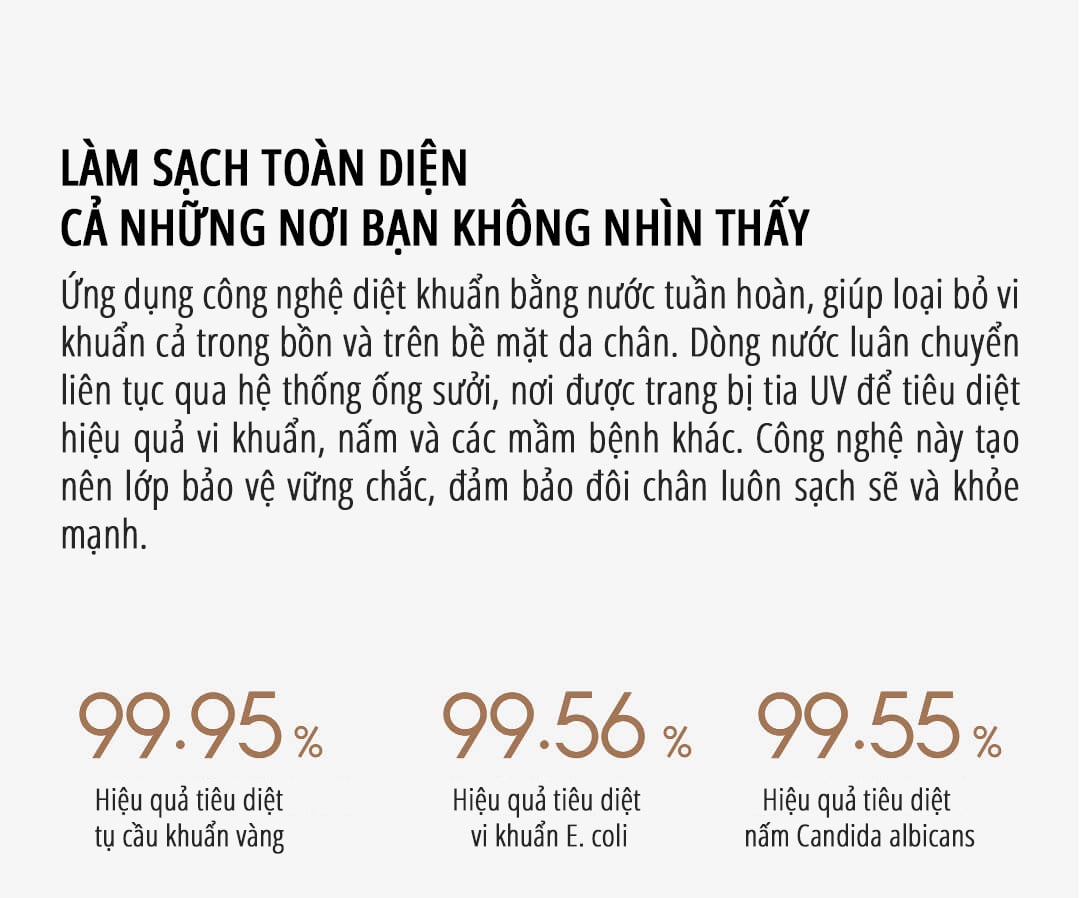 Bồn ngâm chân khử trùng đa năng miLife X6 được tích hợp công nghệ khử trùng UV tiên tiến, mang đến trải nghiệm ngâm chân sạch sẽ và an toàn cho cả gia đình. Hệ thống khử trùng tự động hoạt động ngay trong quá trình sử dụng, giúp loại bỏ vi khuẩn hiệu quả, hạn chế tối đa nguy cơ tiếp xúc với vi khuẩn có hại và đảm bảo vệ sinh toàn diện. Nhờ đó, các thành viên trong gia đình có thể sử dụng liên tục mà không cần chờ đợi, vừa tiết kiệm thời gian vừa nâng cao hiệu quả chăm sóc sức khỏe. Bên cạnh đó, miLife X6 còn ứng dụng công nghệ khử trùng nước hiện đại với khả năng loại bỏ đến 99.55% vi khuẩn, không chỉ làm sạch những khu vực dễ tiếp xúc mà còn xử lý hiệu quả các vùng khó làm sạch trên bàn chân, mang lại sự an tâm và bảo vệ sức khỏe tối ưu trong suốt quá trình ngâm chân.