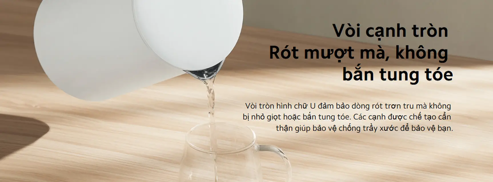 Xiaomi Electric Kettle 2 Lite được thiết kế với vòi rót bo tròn hình chữ U, giúp dòng nước chảy đều, mượt và hạn chế tối đa tình trạng nhỏ giọt hay bắn ra ngoài. Các cạnh vòi được gia công kỹ lưỡng nhằm giảm trầy xước và tăng mức độ an toàn khi sử dụng. Nhờ thiết kế này, việc rót nước trở nên gọn gàng, sạch sẽ và dễ kiểm soát hơn. Đây là chi tiết tiện lợi, phù hợp cho cả người lớn lẫn trẻ em khi sử dụng ấm trong không gian bếp gia đình.