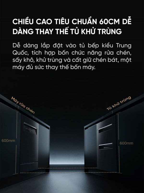 Thiết kế chiều cao tiêu chuẩn 60cm, dễ dàng lắp đặt thay thế tủ khử trùng mà không cần chỉnh sửa tủ bếp. Máy tích hợp bốn chức năng trong một: rửa chén, sấy khô, khử trùng và lưu trữ, mang lại sự tiện lợi, tiết kiệm không gian và chi phí.