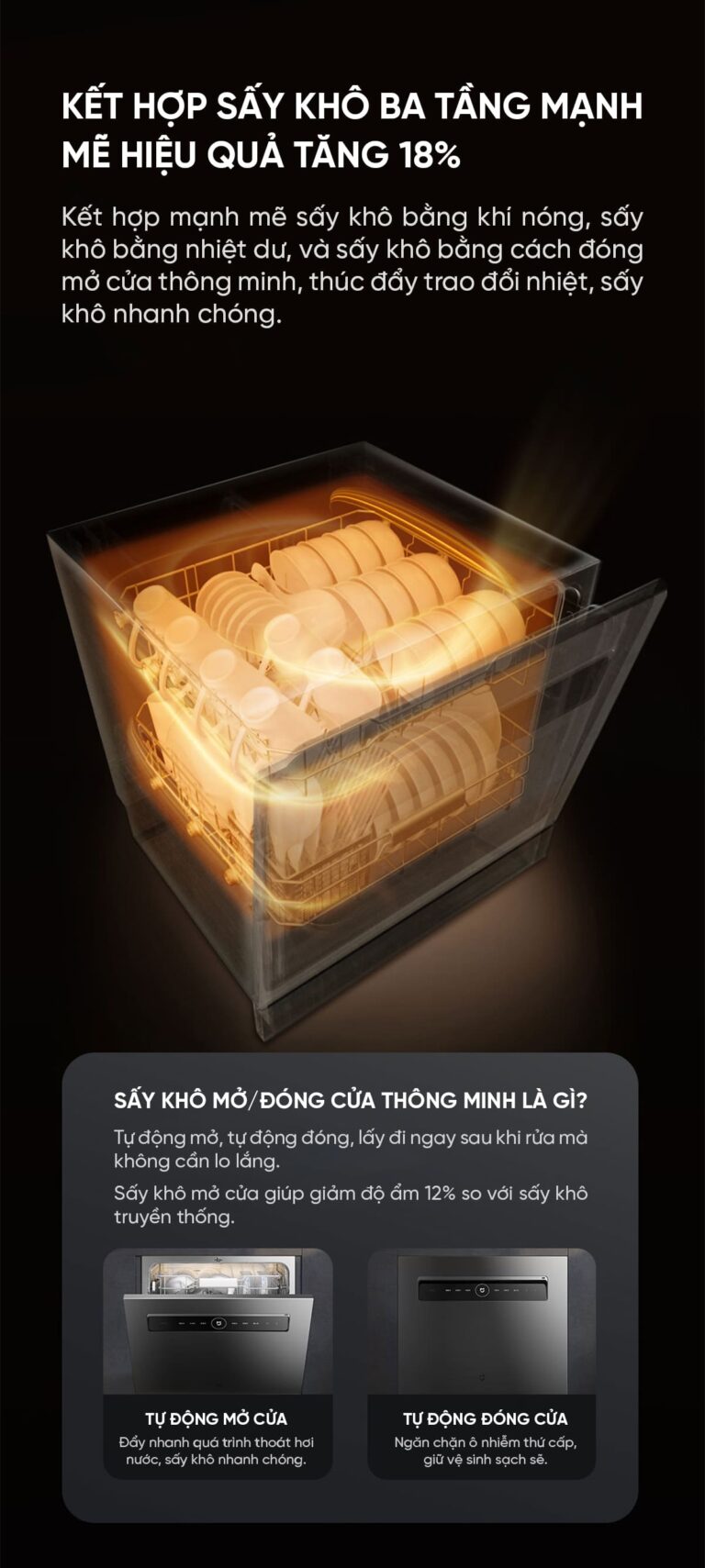 Hệ thống sấy khô ba tầng mạnh mẽ giúp tăng hiệu quả lên đến 18%. Máy kết hợp đồng thời sấy khí nóng, sấy bằng nhiệt dư và sấy khô thông minh qua cơ chế tự động mở cửa, giúp luồng khí lưu thông tốt hơn, rút ngắn thời gian sấy và đảm bảo bát đĩa luôn khô ráo, sạch khuẩn.