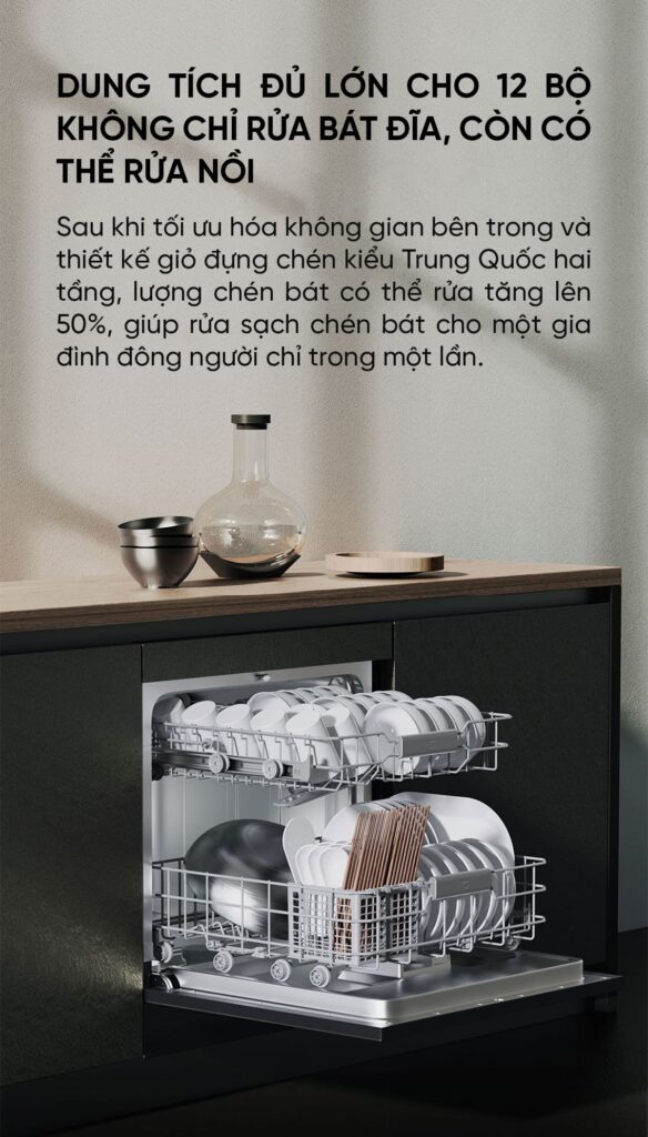 Dung tích 12 bộ siêu lớn, dễ dàng chứa cả nồi, chảo và bát đĩa cho gia đình đông người. Thiết kế giỏ đựng hai tầng giúp tối ưu không gian, tăng sức chứa lên 50%, rửa sạch toàn bộ chén bát chỉ trong một chu trình duy nhất.