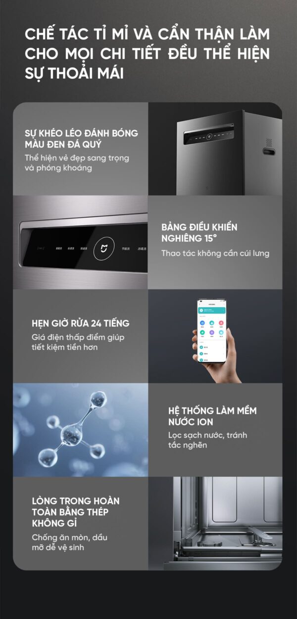 Máy rửa bát Xiaomi Mijia S1 được chế tác tỉ mỉ, từng chi tiết đều hướng đến sự tiện lợi và thoải mái cho người dùng. Bề mặt màu đen đá quý được đánh bóng tinh xảo, mang đến vẻ sang trọng và hiện đại cho căn bếp. Bảng điều khiển nghiêng 15° giúp thao tác dễ dàng mà không cần cúi lưng, kết hợp chức năng hẹn giờ rửa lên đến 24 tiếng, tận dụng mức giá điện thấp để tiết kiệm chi phí. Máy còn trang bị hệ thống làm mềm nước bằng ion, lọc sạch nước, ngăn tắc nghẽn hiệu quả. Lòng trong bằng thép không gỉ chống ăn mòn, dễ vệ sinh dầu mỡ, đảm bảo bát đĩa luôn sạch sẽ và bền bỉ theo thời gian.