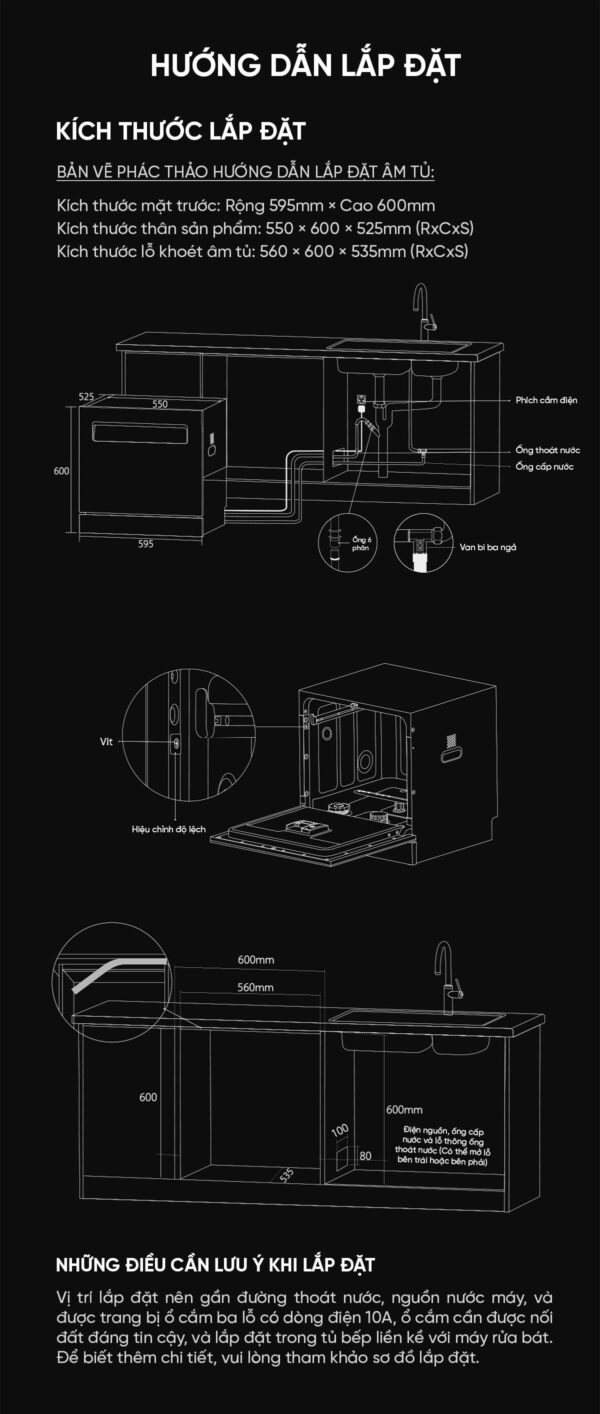 Kích thước khoét lỗ lắp đặt: 560 x 600 x 535mm (RxCxS)