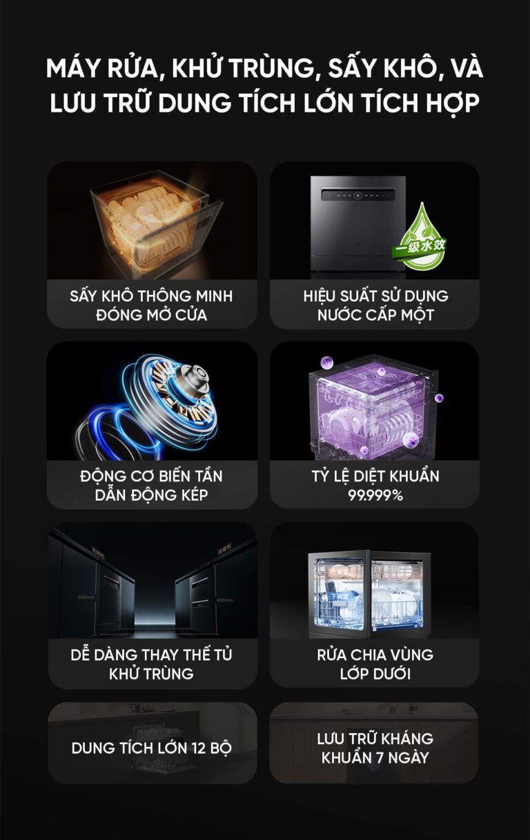 Thiết kế chiều cao tiêu chuẩn 60cm, dễ dàng lắp đặt thay thế tủ khử trùng mà không cần chỉnh sửa tủ bếp. Máy tích hợp bốn chức năng trong một: rửa chén, sấy khô, khử trùng và lưu trữ, mang lại sự tiện lợi, tiết kiệm không gian và chi phí.