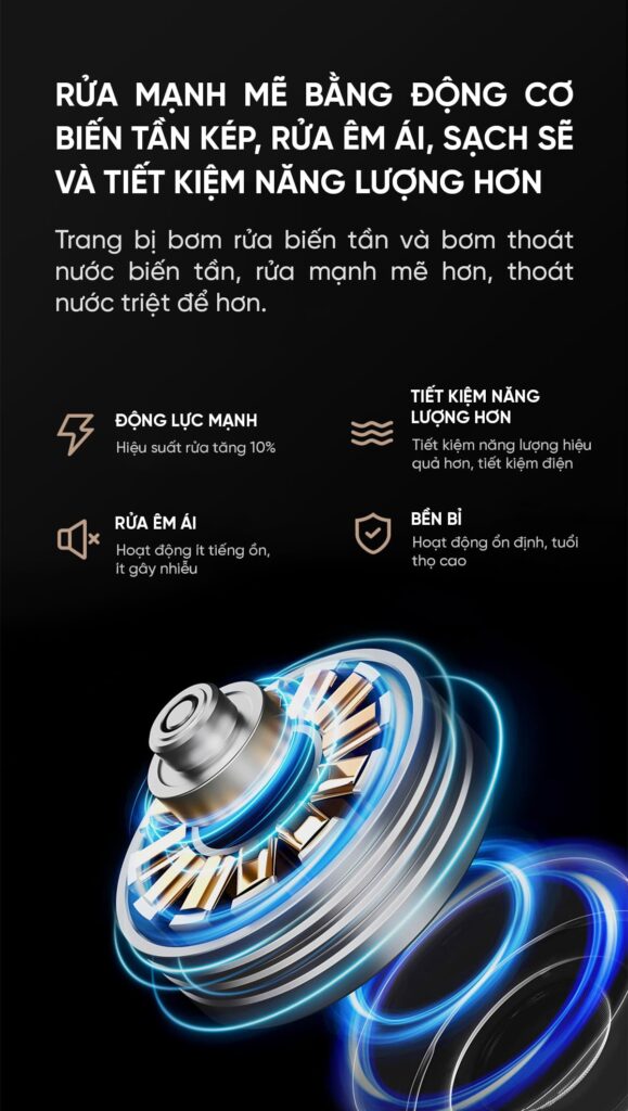 Máy rửa bát Xiaomi Mijia S1 sử dụng hệ thống động cơ biến tần kép gồm bơm rửa và bơm thoát nước, mang lại khả năng rửa mạnh mẽ, sạch sâu và thoát nước triệt để hơn. Hiệu suất rửa tăng 10%, đồng thời tiết kiệm năng lượng hiệu quả, giảm tiêu thụ điện đáng kể. Máy vận hành êm ái, tiếng ồn thấp, không gây ảnh hưởng đến sinh hoạt hàng ngày. Cấu trúc bền bỉ, hoạt động ổn định và có tuổi thọ cao, đảm bảo sử dụng lâu dài và tiết kiệm chi phí.