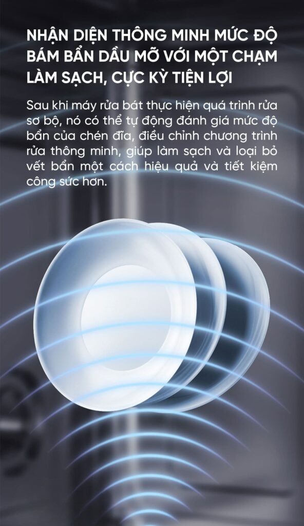 Máy rửa bát được trang bị tính năng nhận diện thông minh mức độ bám bẩn của dầu mỡ. Sau khi rửa sơ bộ, hệ thống sẽ tự động phân tích độ bẩn của bát đĩa và điều chỉnh chu trình rửa phù hợp. Nhờ đó, quá trình làm sạch trở nên hiệu quả hơn, tiết kiệm thời gian, nước và điện năng, mang lại sự tiện lợi tối đa chỉ với một chạm.