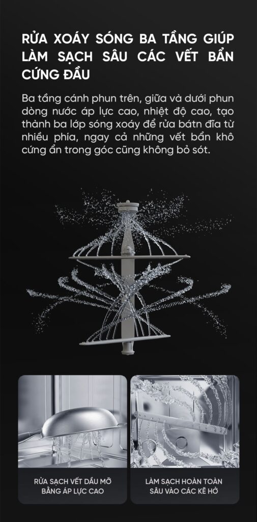 Công nghệ rửa xoáy sóng ba tầng giúp làm sạch sâu và triệt để mọi vết bẩn cứng đầu. Ba cánh phun nước ở các tầng trên, giữa và dưới hoạt động đồng thời, tạo luồng nước áp lực cao và nhiệt độ lớn, hình thành ba lớp sóng xoáy mạnh mẽ. Nhờ đó, bát đĩa được rửa sạch toàn diện từ nhiều hướng, kể cả những vết bẩn khô bám sâu trong góc cũng được loại bỏ dễ dàng.