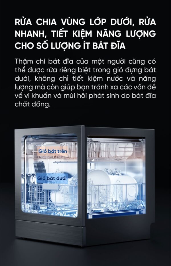Chế độ rửa chia vùng lớp dưới cho phép bạn rửa riêng số lượng ít bát đĩa, lý tưởng cho bữa ăn của một hoặc hai người. Tính năng này giúp tiết kiệm nước và điện năng đáng kể, đồng thời ngăn ngừa vi khuẩn và mùi hôi do bát đĩa để lâu. Giờ đây, bạn có thể rửa sạch nhanh gọn mỗi ngày mà vẫn đảm bảo hiệu quả và vệ sinh tối ưu.