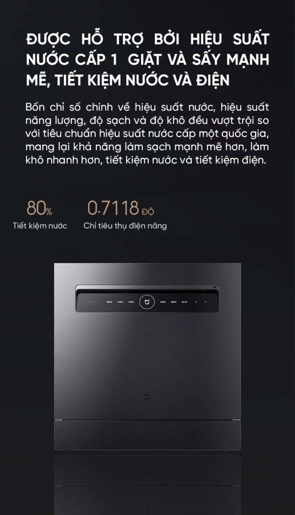Máy rửa bát Xiaomi Mijia S1 đạt hiệu suất nước cấp 1 quốc gia với khả năng rửa và sấy cực kỳ mạnh mẽ nhưng vẫn tiết kiệm năng lượng. Bốn chỉ số quan trọng gồm hiệu suất nước, hiệu suất năng lượng, độ sạch và độ khô đều vượt mức tiêu chuẩn, giúp làm sạch nhanh hơn, khô hơn và tiết kiệm hơn. Máy tiết kiệm đến 80% lượng nước và chỉ tiêu thụ khoảng 0.7118 kWh điện cho mỗi chu trình, mang lại hiệu quả vận hành vượt trội và thân thiện với môi trường.