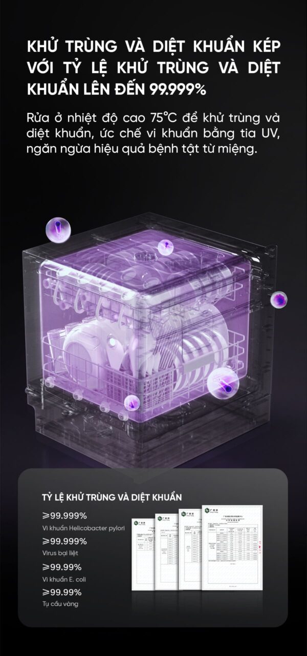 Máy rửa bát Xiaomi Mijia S1 được trang bị hệ thống khử trùng và diệt khuẩn kép với hiệu quả lên đến 99.999%. Quá trình rửa bằng nước nóng 75°C giúp tiêu diệt hầu hết vi khuẩn và mầm bệnh, trong khi tia UV hoạt động song song để ức chế và ngăn ngừa tái nhiễm khuẩn. Nhờ đó, bát đĩa luôn sạch sẽ, an toàn và bảo vệ sức khỏe cho cả gia đình.