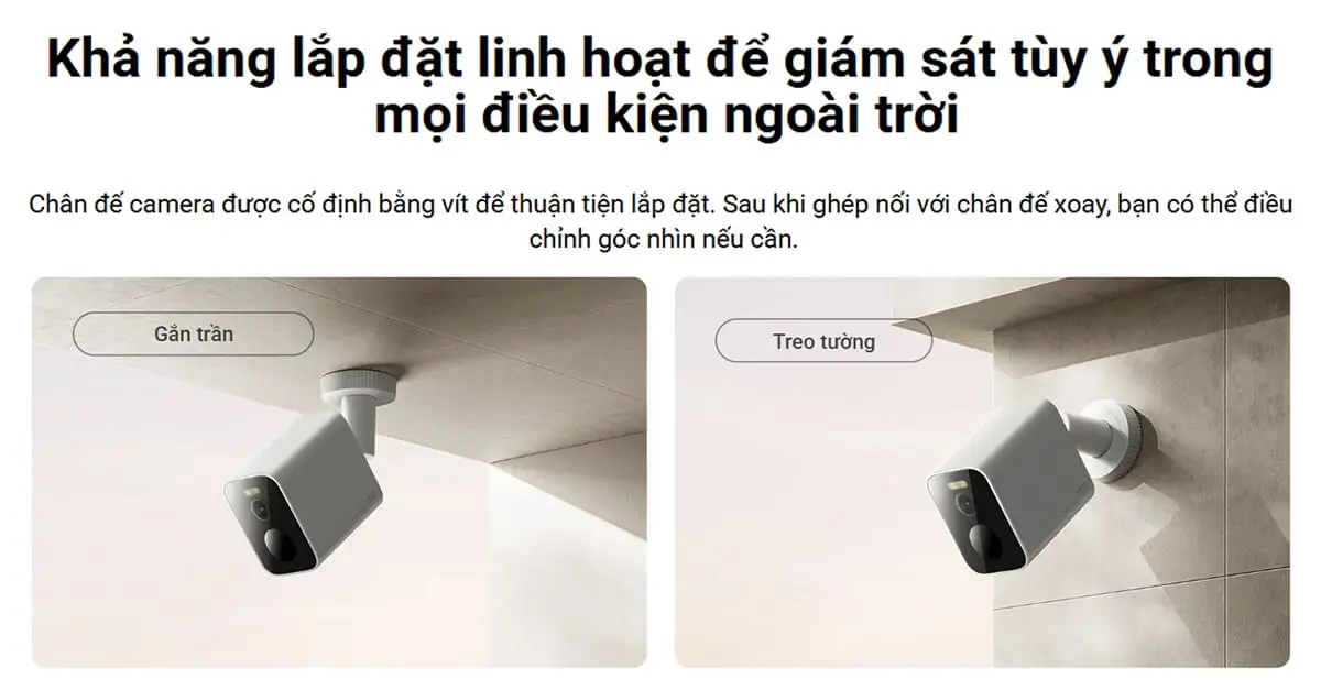 Camera ngoài trời Xiaomi BW300 được trang bị chân đế cố định bằng vít, cho phép lắp đặt linh hoạt trên trần hoặc treo tường. Khi kết nối với chân đế xoay, bạn có thể điều chỉnh góc nhìn dễ dàng, đảm bảo bao quát toàn bộ khu vực giám sát, phù hợp với mọi địa hình ngoài trời.
