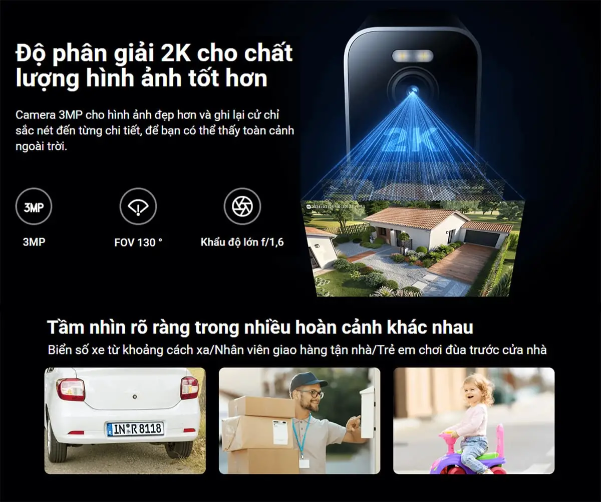 Camera ngoài trời Xiaomi 3MP BW300 đi kèm cảm biến 3MP, cho hình ảnh sắc nét với độ phân giải lên tới 2K. Nhờ đó, bạn có thể dễ dàng quan sát mọi chi tiết trong khu vực lắp đặt, từ biển số xe, người giao hàng đến trẻ em đang vui chơi trước sân, đảm bảo an toàn và kiểm soát không gian hiệu quả.