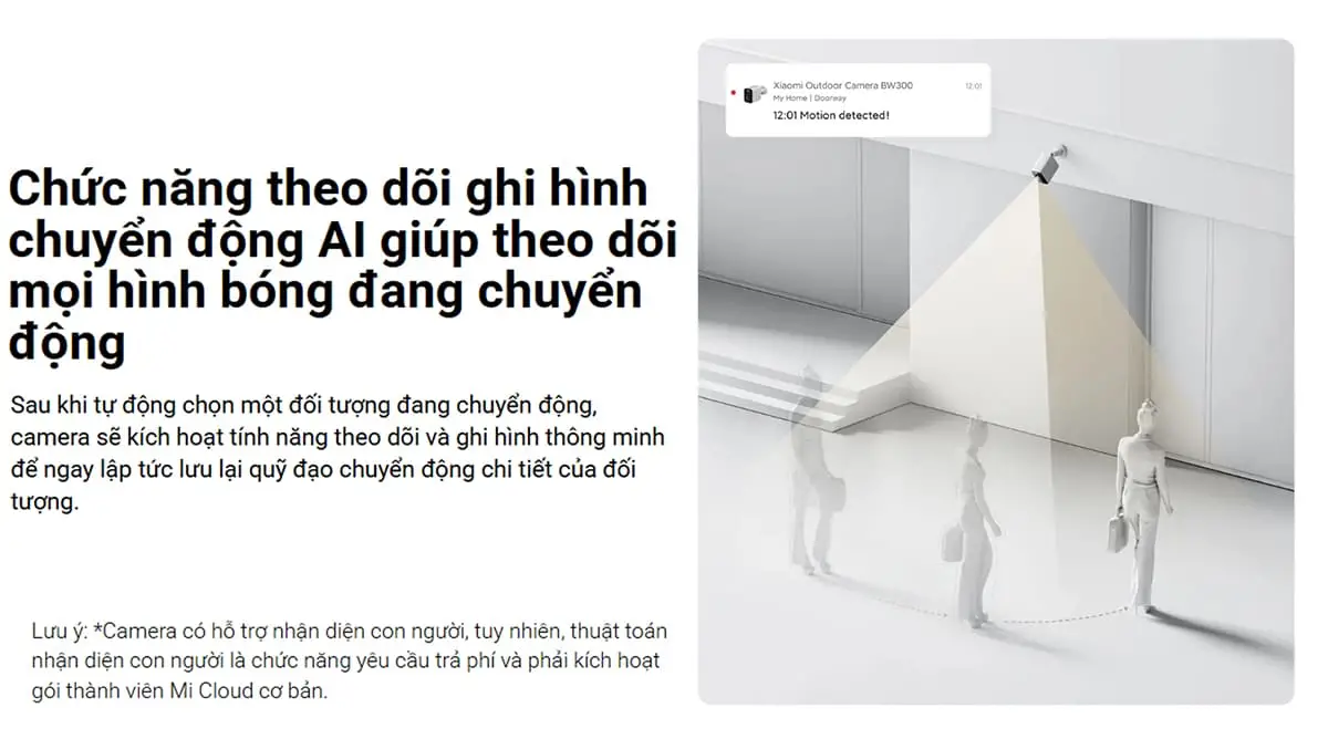 Camera ngoài trời Xiaomi 3MP BW300 được tích hợp trí tuệ nhân tạo (AI) thông minh, giúp tự động phát hiện và theo dõi mọi chuyển động trong không gian sống. Khi có đối tượng lạ xuất hiện, camera sẽ lập tức kích hoạt chế độ theo dõi và ghi hình, đảm bảo lưu lại toàn bộ quá trình di chuyển một cách chi tiết.