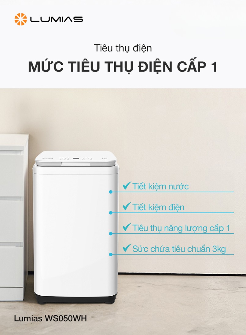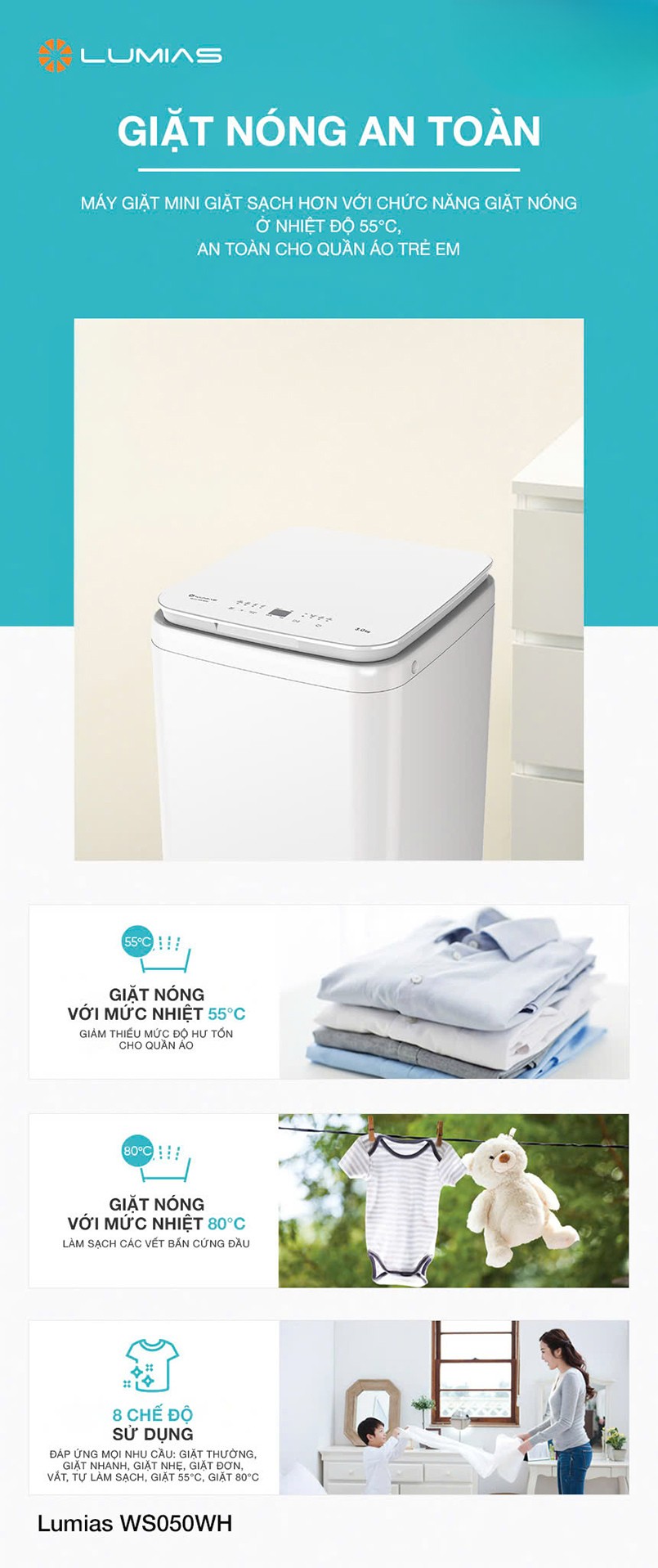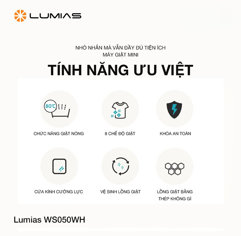 Máy giặt mini Lumias WS050WH với chức năng giặt nhiệt độ cao là lựa chọn hoàn hảo cho không gian sống nhỏ hẹp. Dù dung tích chỉ 3.0kg và thiết kế gọn gàng, máy vẫn trang bị đầy đủ tiện ích: 8 chương trình giặt cài sẵn, chức năng vệ sinh lồng giặt, khóa an toàn và chế độ hẹn giờ. Điểm nổi bật là chế độ giặt nóng, an toàn cho quần áo trẻ em; lồng giặt làm từ thép không gỉ cùng cửa kính cường lực tăng độ bền và thẩm mỹ. Bên cạnh đó, máy ứng dụng công nghệ hiện đại giúp tiết kiệm điện và vận hành êm ái.