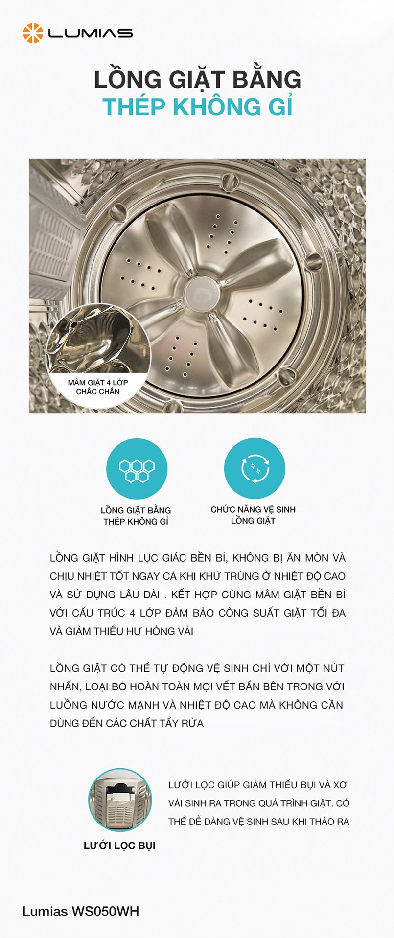 Lồng máy giặt mini Lumias WS050WH bằng thép không gỉ, mâm giặt 4 lớp