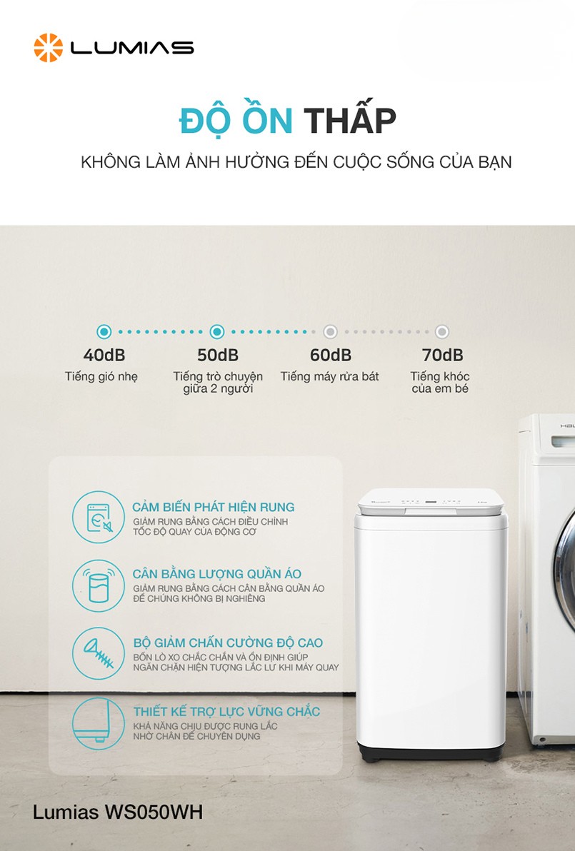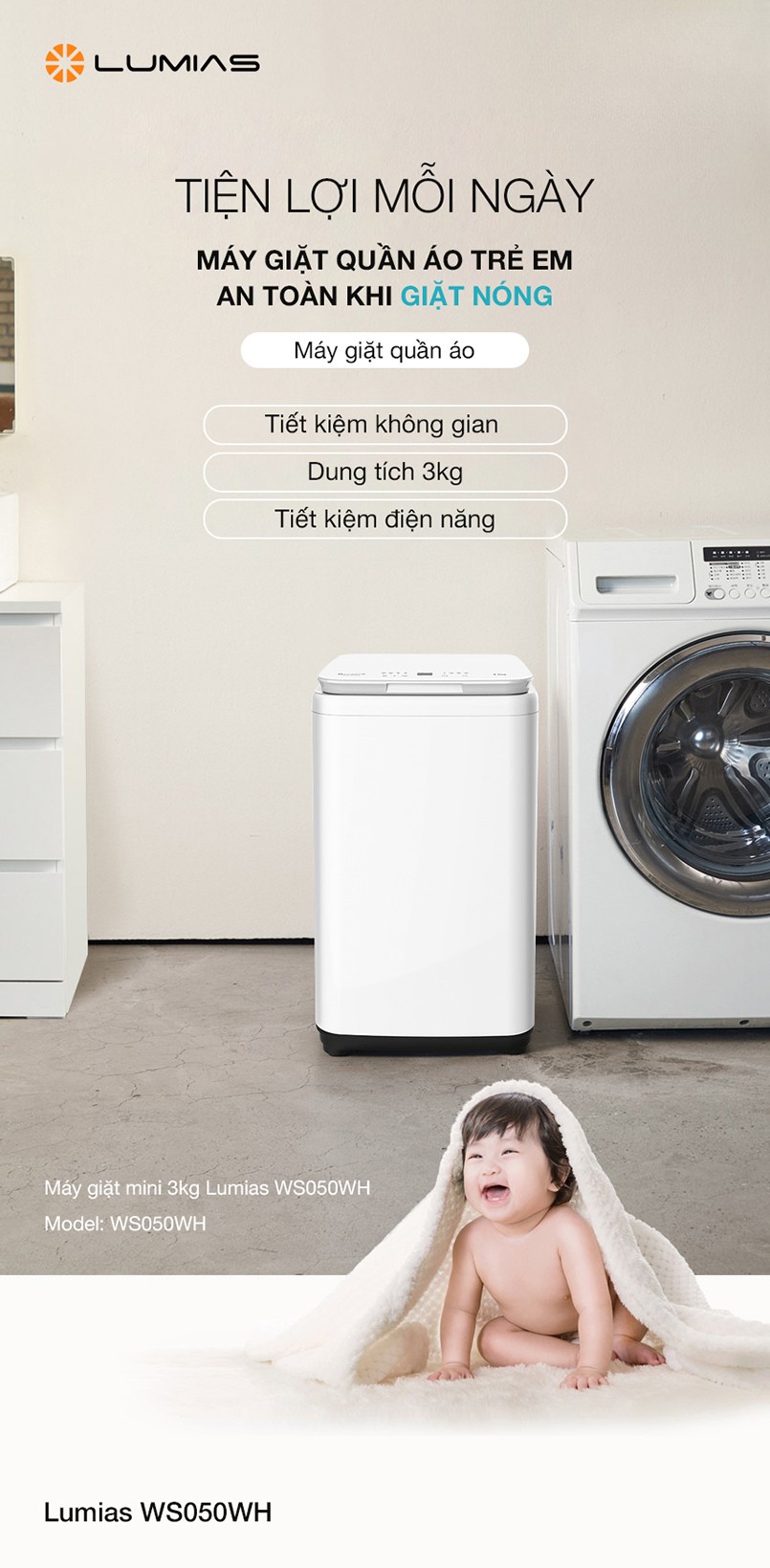 Máy giặt mini Lumias WS050WH — giặt nhiệt độ cao, an toàn và tiện lợi. Đây là giải pháp hoàn hảo cho không gian sống nhỏ hẹp: thiết kế gọn nhẹ, khối lượng giặt 3.0kg phù hợp căn hộ nhỏ, nhà trọ, dễ di chuyển và lắp đặt. Đặc biệt lý tưởng cho các mẹ bỉm sữa muốn giặt riêng quần áo trẻ em. Lumias chú trọng an toàn và trải nghiệm người dùng, vì vậy WS050WH được hoàn thiện tỉ mỉ: cửa kính cường lực sang trọng, bền bỉ và cơ chế đóng chậm trượt xuống êm ái, giảm rủi ro chấn thương khi sử dụng.