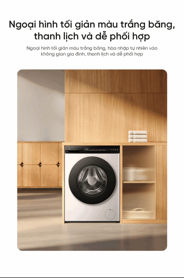 Máy giặt Mijia sở hữu ngoại hình tối giản với gam màu trắng băng tinh tế, dễ dàng hòa nhập vào mọi không gian sống. Thiết kế thanh lịch, hiện đại giúp máy trở thành điểm nhấn nhẹ nhàng mà vẫn hài hòa và dễ phối hợp với các phong cách nội thất khác nhau.