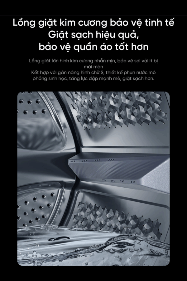 Lồng giặt lớn hình kim cương với bề mặt nhẵn mịn, giúp bảo vệ sợi vải tối đa và hạn chế mài mòn trong quá trình giặt. Thiết kế gân nâng hình chữ S kết hợp công nghệ phun nước mô phỏng sinh học tạo lực nước mạnh mẽ, giúp đánh bay vết bẩn hiệu quả hơn, đồng thời giữ cho quần áo luôn mềm mại và bền đẹp như mới.