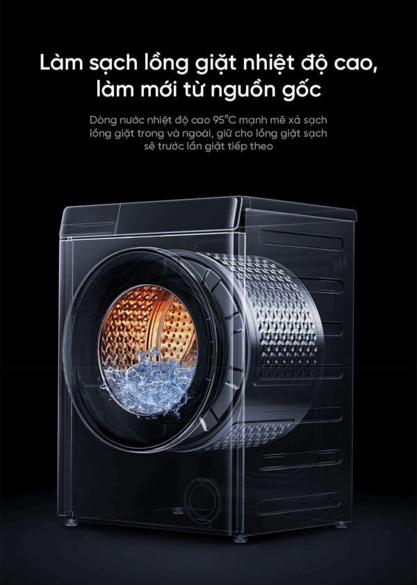 Chức năng làm sạch lồng giặt bằng nhiệt độ cao 95°C giúp làm mới và vệ sinh toàn diện từ bên trong. Dòng nước nóng mạnh mẽ cuốn trôi cặn bẩn, vi khuẩn và mùi hôi, đảm bảo lồng giặt luôn sạch sẽ, tinh khiết trước mỗi lần sử dụng tiếp theo, mang lại hiệu quả giặt tối ưu và an toàn cho quần áo.