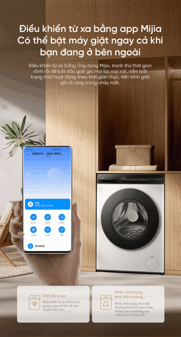 Hỗ trợ điều khiển từ xa thông qua ứng dụng Mijia, giúp bạn dễ dàng quản lý việc giặt giũ mọi lúc, mọi nơi. Ngay cả khi đang ở bên ngoài, bạn vẫn có thể bật máy, theo dõi trạng thái hoạt động và tiến trình giặt trong thời gian thực. Nhờ đó, bạn có thể tận dụng tối đa thời gian rảnh, chủ động sắp xếp công việc và tận hưởng cuộc sống tiện nghi, thông minh hơn.