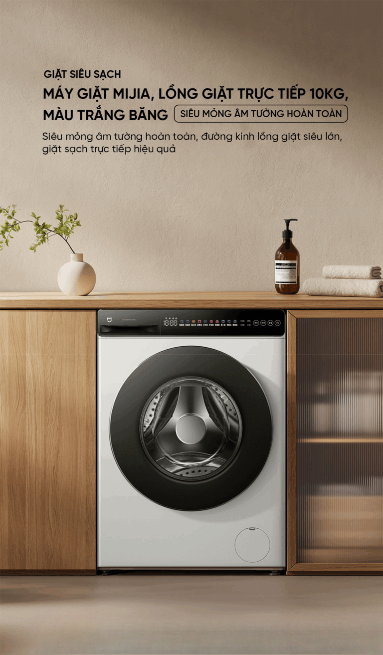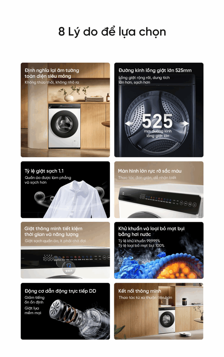 Máy giặt Mijia mang đến 8 lý do thuyết phục để bạn lựa chọn. Thiết kế âm tường siêu mỏng, tinh gọn và hiện đại – không thừa thãi, không nhô ra, giúp tối ưu không gian sống. Lồng giặt lớn 525mm mang đến không gian rộng rãi hơn, tăng dung tích và hiệu quả giặt sạch vượt trội với tỷ lệ giặt sạch 1.1, giúp quần áo luôn phẳng phiu, sạch sẽ. Màn hình màu kích thước lớn hiển thị rõ ràng, thao tác đơn giản, dễ sử dụng. Công nghệ giặt thông minh giúp tiết kiệm thời gian và năng lượng, đồng thời chức năng khử khuẩn bằng hơi nước loại bỏ tới 99,999% vi khuẩn và 100% mạt bụi, bảo vệ sức khỏe cho cả gia đình. Động cơ DD dẫn động trực tiếp hoạt động êm ái, ổn định, cho cảm giác nhẹ nhàng như giặt lụa. Cuối cùng, máy còn hỗ trợ kết nối thông minh, cho phép điều khiển và theo dõi từ xa vô cùng tiện lợi.