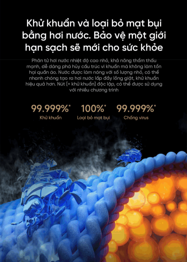 Công nghệ khử khuẩn và loại bỏ mạt bụi bằng hơi nước của máy giặt Mijia mở ra chuẩn mực mới về sự sạch sẽ và an toàn cho sức khỏe. Các phân tử hơi nước nhiệt độ cao với kích thước siêu nhỏ có khả năng thẩm thấu sâu, dễ dàng phá hủy cấu trúc vi khuẩn mà không làm hư hại sợi vải. Hệ thống gia nhiệt thông minh giúp tạo hơi nước nhanh chóng chỉ với một lượng nước nhỏ, lấp đầy toàn bộ lồng giặt để khử khuẩn hiệu quả hơn. Nút [+ khử khuẩn] được thiết kế độc lập, cho phép kết hợp linh hoạt với nhiều chương trình giặt khác nhau. Máy đạt hiệu quả khử khuẩn đến 99.999%, loại bỏ 100% mạt bụi và chống virus hiệu quả, mang đến sự an tâm tuyệt đối cho gia đình bạn.