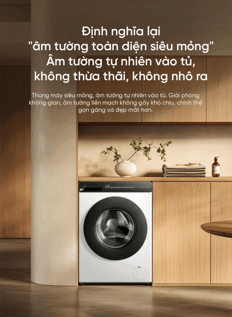 Máy giặt Mijia định nghĩa lại khái niệm “âm tường toàn diện siêu mỏng” với thiết kế thùng máy mảnh gọn, dễ dàng lắp đặt liền mạch vào tủ mà không thừa thãi hay nhô ra. Kiểu dáng tinh tế giúp giải phóng không gian, mang đến tổng thể hài hòa, gọn gàng và đẹp mắt cho không gian sống.