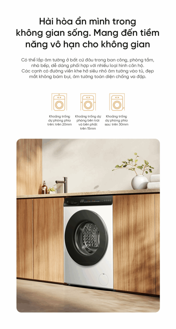 Máy giặt Mijia hài hòa ẩn mình trong không gian sống, mang đến tiềm năng vô hạn cho thiết kế nội thất. Nhờ khả năng lắp âm tường linh hoạt, máy có thể đặt ở bất kỳ đâu – từ ban công, phòng tắm đến nhà bếp – dễ dàng hòa hợp với nhiều kiểu căn hộ khác nhau. Các cạnh được thiết kế với đường viền khe hở siêu nhỏ, liền mạch vào tủ, vừa thẩm mỹ vừa hạn chế bám bụi, đồng thời tăng khả năng chống va đập, tạo nên tổng thể tinh tế và bền bỉ.