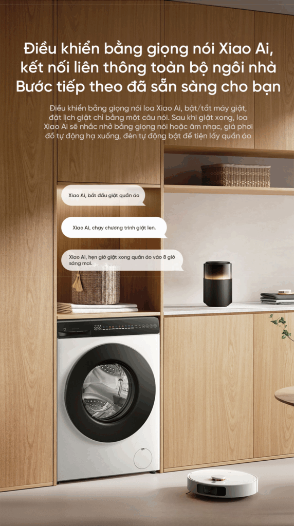 Máy giặt Mijia hỗ trợ điều khiển bằng giọng nói qua trợ lý Xiao Ai, mang đến trải nghiệm sử dụng thông minh và tiện lợi. Bạn có thể bật hoặc tắt máy, đặt lịch giặt chỉ bằng một câu lệnh đơn giản. Khi quá trình giặt hoàn tất, loa Xiao Ai sẽ tự động thông báo bằng giọng nói hoặc âm nhạc, đồng thời kích hoạt các thiết bị liên kết trong nhà như giá phơi tự động hạ xuống hay đèn bật sáng, giúp bạn dễ dàng lấy quần áo – tất cả đều diễn ra một cách liền mạch và hiện đại.