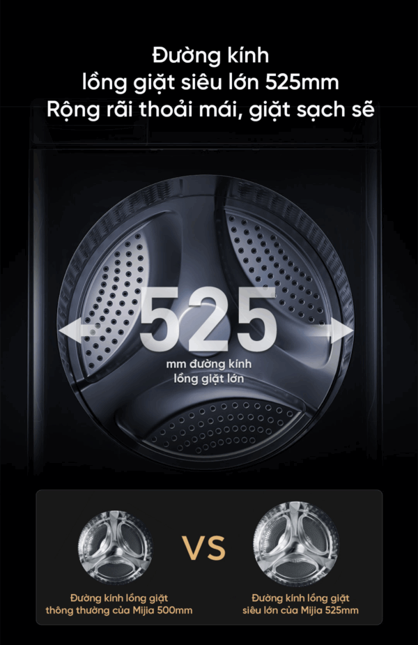 Máy giặt Mijia được trang bị lồng giặt siêu lớn với đường kính 525mm, mang đến không gian rộng rãi và thoải mái cho quần áo. Thiết kế này giúp tăng khả năng giặt sạch, cho hiệu quả làm sạch tối ưu trong mỗi lần sử dụng.