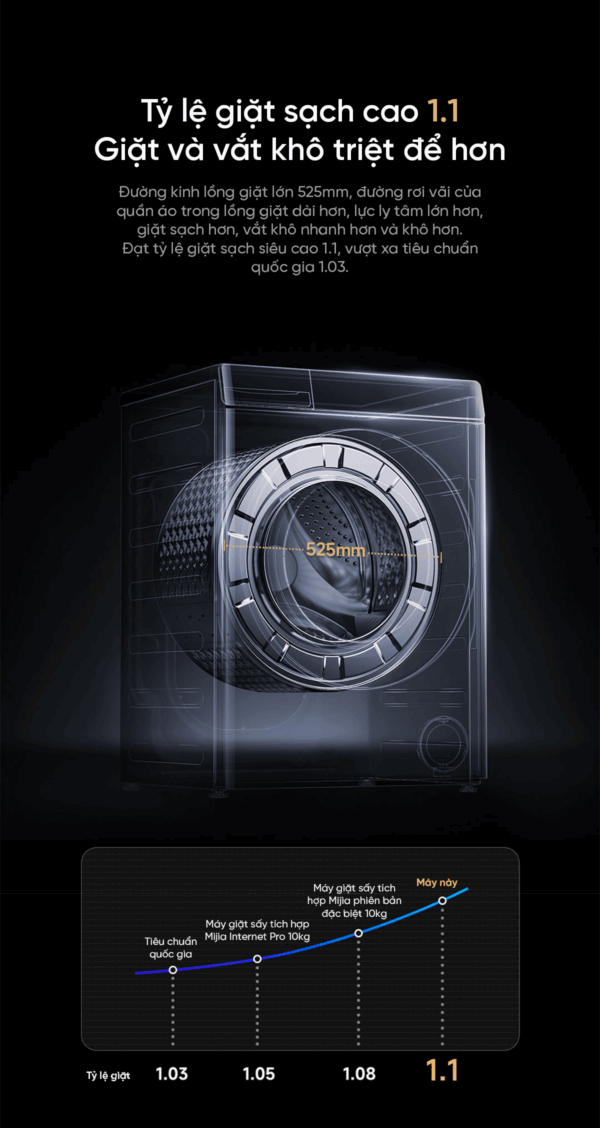 Máy giặt Mijia đạt tỷ lệ giặt sạch cao 1.1, mang đến khả năng giặt và vắt khô triệt để hơn. Với lồng giặt đường kính lớn 525mm, quần áo có quãng rơi dài hơn trong quá trình quay, tạo ra lực ly tâm mạnh hơn giúp đánh bật vết bẩn hiệu quả, giặt sạch sâu và vắt khô nhanh chóng. Hiệu suất giặt sạch vượt trội này cao hơn đáng kể so với tiêu chuẩn quốc gia 1.03, đảm bảo quần áo luôn sạch tinh tươm và khô ráo sau mỗi lần giặt.