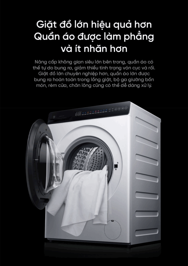 Máy được nâng cấp với không gian lồng giặt siêu lớn, giúp quần áo có thể tự do chuyển động, giảm tình trạng vón cục hay rối sợi. Nhờ đó, quần áo sau khi giặt được làm phẳng hơn, ít nhăn hơn và sạch sâu hơn. Máy giặt còn xử lý hiệu quả các đồ cỡ lớn như bộ ga giường, rèm cửa hay chăn lông, mang lại khả năng giặt chuyên nghiệp và tiện lợi ngay tại nhà.