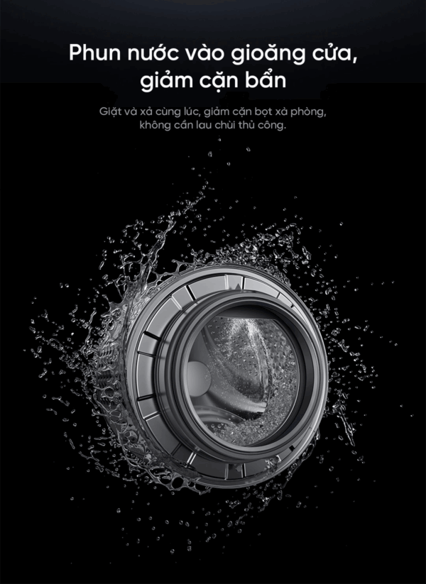 Công nghệ phun nước vào gioăng cửa giúp làm sạch tự động trong quá trình giặt và xả, giảm đáng kể cặn bẩn và bọt xà phòng bám lại. Nhờ đó, người dùng không cần lau chùi thủ công, giữ cho máy luôn sạch sẽ và hoạt động bền bỉ theo thời gian.