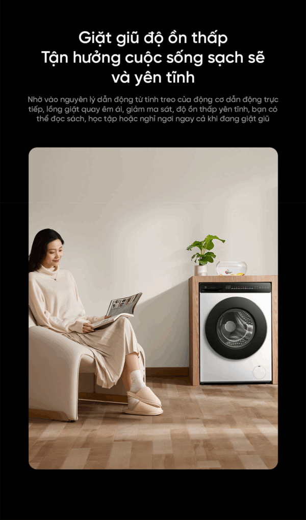 Mang đến trải nghiệm giặt giũ yên tĩnh và dễ chịu nhờ công nghệ dẫn động từ tính treo của động cơ dẫn động trực tiếp. Cơ chế quay êm ái giúp giảm ma sát, hạn chế tiếng ồn tối đa, cho phép bạn thoải mái đọc sách, học tập hoặc nghỉ ngơi ngay cả khi máy đang hoạt động, tận hưởng cuộc sống sạch sẽ và tĩnh lặng hơn mỗi ngày.