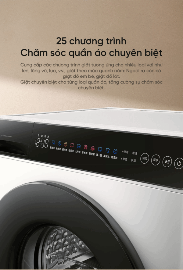 Được trang bị 25 chương trình giặt chuyên biệt, đáp ứng nhu cầu chăm sóc cho từng loại quần áo khác nhau. Từ len, lông vũ đến lụa, mỗi chất liệu đều có chế độ giặt riêng phù hợp theo mùa trong năm. Ngoài ra, máy còn có các chế độ đặc biệt như giặt đồ em bé hay giặt đồ lót, giúp làm sạch nhẹ nhàng nhưng hiệu quả, mang đến sự chăm sóc toàn diện và tinh tế cho từng sợi vải.