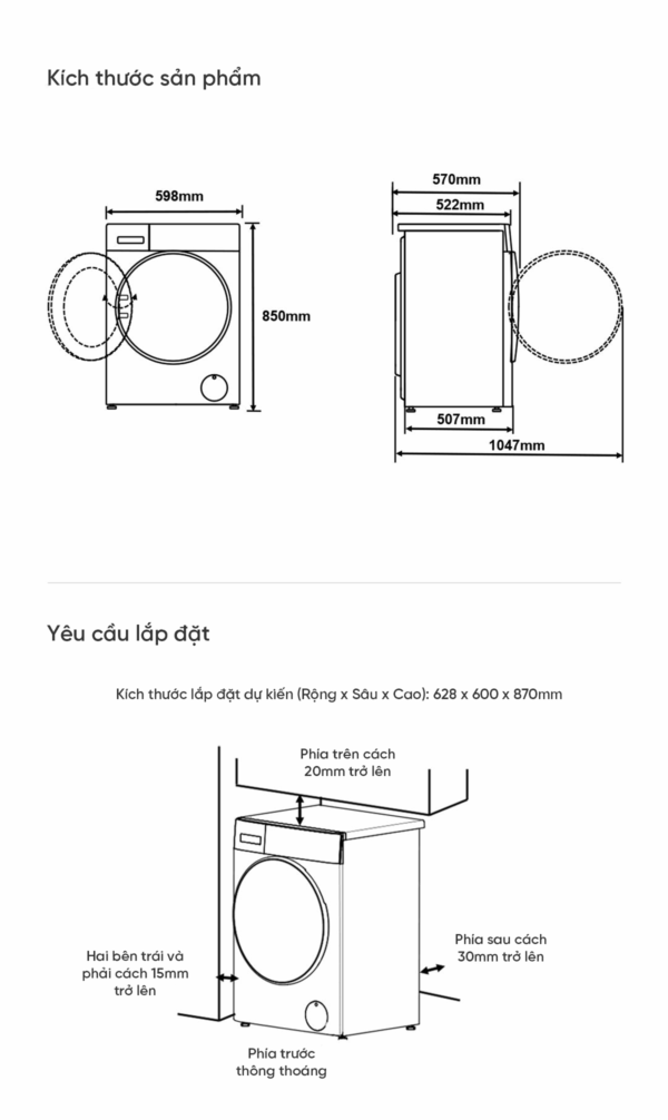 Kích thước sản phẩm (Rộng x Sâu x Cao): 598 x 570 x 850mm