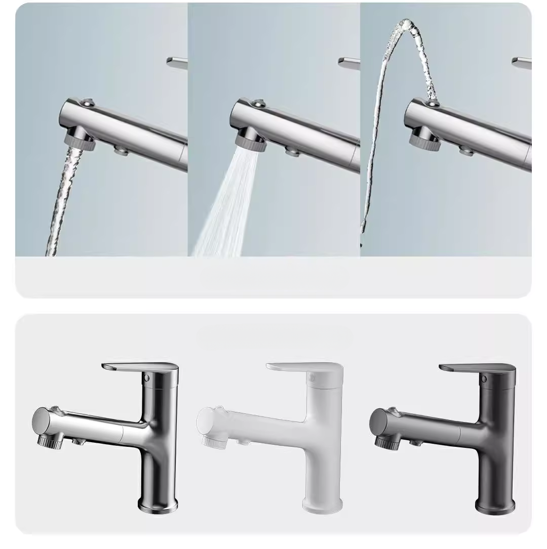 Vòi lavabo kéo rút DABAI A1 được thiết kế tiện lợi với 3 chế độ xả gồm nước siêu mịn, nước tạo bọt và tia nước mạnh, giúp bạn linh hoạt sử dụng trong mọi nhu cầu rửa mặt, rửa tay hay vệ sinh chậu. Đầu vòi có thể kéo rút và điều chỉnh góc dễ dàng, mang lại sự thuận tiện khi súc miệng hoặc làm sạch khu vực xung quanh. Thiết kế thông minh, giảm bắn nước, tiết kiệm nước và phù hợp cho mọi không gian phòng tắm hiện đại.