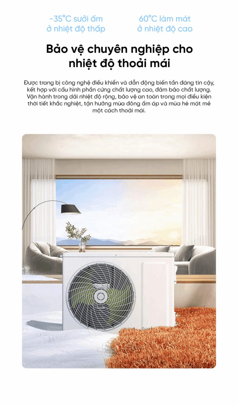 Máy được thiết kế để hoạt động ổn định trong dải nhiệt độ cực rộng: sưởi ấm hiệu quả ở mức -35°C và làm mát tốt ngay cả khi nhiệt độ ngoài trời lên tới 60°C. Nhờ công nghệ điều khiển biến tần tiên tiến cùng phần cứng chất lượng cao, thiết bị đảm bảo vận hành bền bỉ và an toàn trong mọi điều kiện thời tiết khắc nghiệt. Dù là mùa đông lạnh giá hay mùa hè oi bức, bạn đều được tận hưởng không gian thoải mái và dễ chịu nhất.