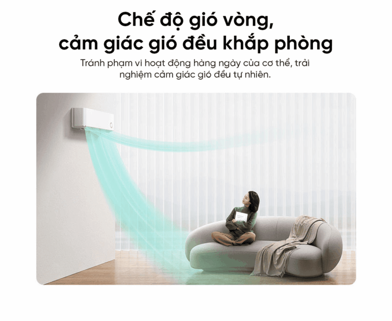 Chế độ gió vòng mang đến luồng gió lưu thông khắp không gian, phân bổ nhiệt độ đồng đều ở mọi vị trí trong phòng. Cơ chế thổi gió thông minh giúp tránh thổi trực tiếp vào cơ thể, tạo cảm giác dễ chịu, thoải mái và tự nhiên trong từng khoảnh khắc sử dụng.
