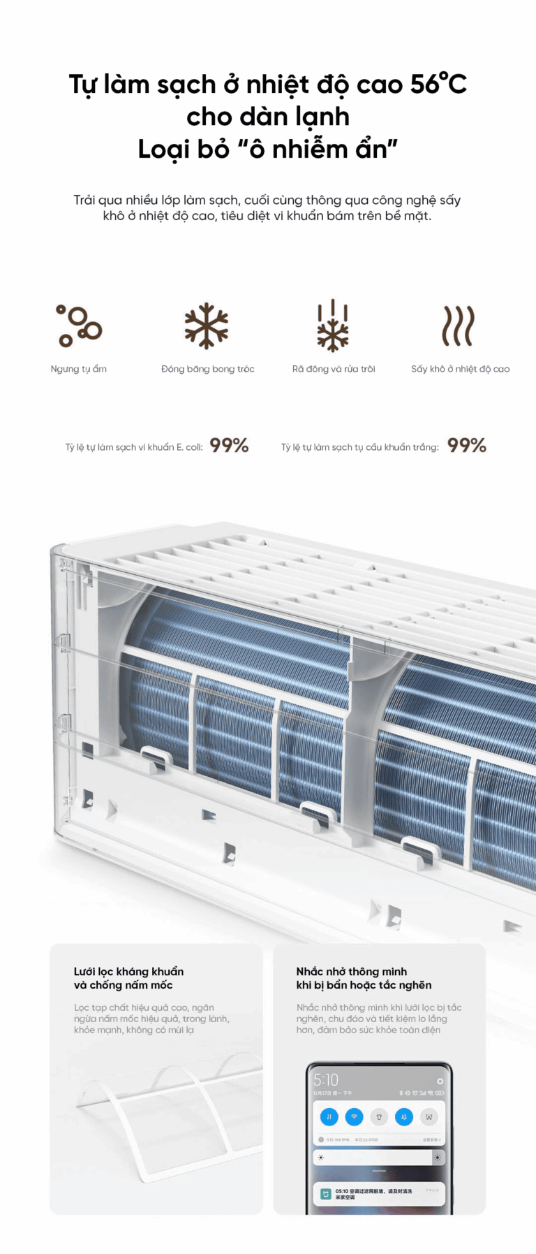 Chức năng tự làm sạch ở nhiệt độ cao 56°C giúp loại bỏ hoàn toàn “ô nhiễm ẩn” bên trong dàn lạnh. Quá trình này diễn ra qua nhiều bước: ngưng tụ ẩm, đóng băng bong tróc, rã đông và rửa trôi, sau đó sấy khô ở nhiệt độ cao để tiêu diệt vi khuẩn còn sót lại. Hiệu quả làm sạch đạt tỷ lệ 99% đối với vi khuẩn E. coli và tụ cầu khuẩn trắng, đảm bảo không khí trong lành và an toàn hơn cho sức khỏe người dùng.