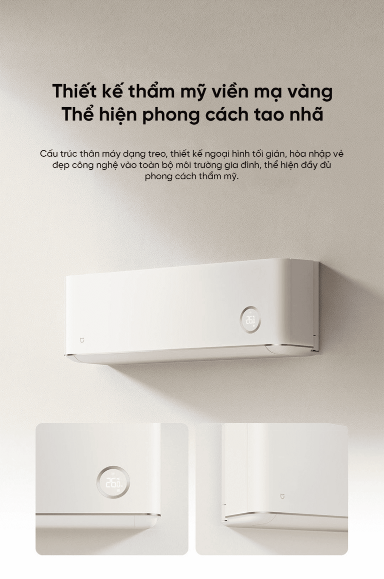 Máy điều hòa Mijia được thiết kế với viền mạ vàng tinh tế, tôn lên vẻ đẹp sang trọng và tao nhã. Thân máy dạng treo gọn gàng, kết hợp phong cách tối giản hiện đại, dễ dàng hòa hợp với mọi không gian nội thất. Từng chi tiết được hoàn thiện tỉ mỉ, mang đến cảm giác tinh tế và đẳng cấp, thể hiện trọn vẹn phong cách thẩm mỹ của gia chủ.