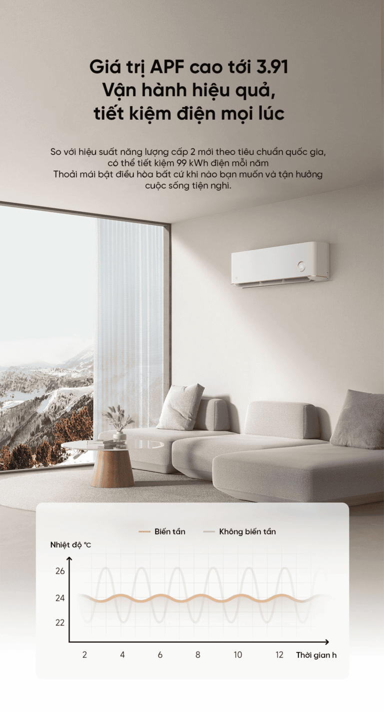 Chỉ số hiệu suất năng lượng (APF) của máy đạt tới 3.91, giúp vận hành ổn định và tiết kiệm điện vượt trội trong mọi điều kiện. So với tiêu chuẩn hiệu suất năng lượng cấp 2 mới, thiết bị có thể tiết kiệm tới 99 kWh điện mỗi năm. Nhờ đó, bạn có thể thoải mái bật điều hòa bất cứ lúc nào mà không lo tốn điện, tận hưởng trọn vẹn sự tiện nghi và mát lạnh mỗi ngày.