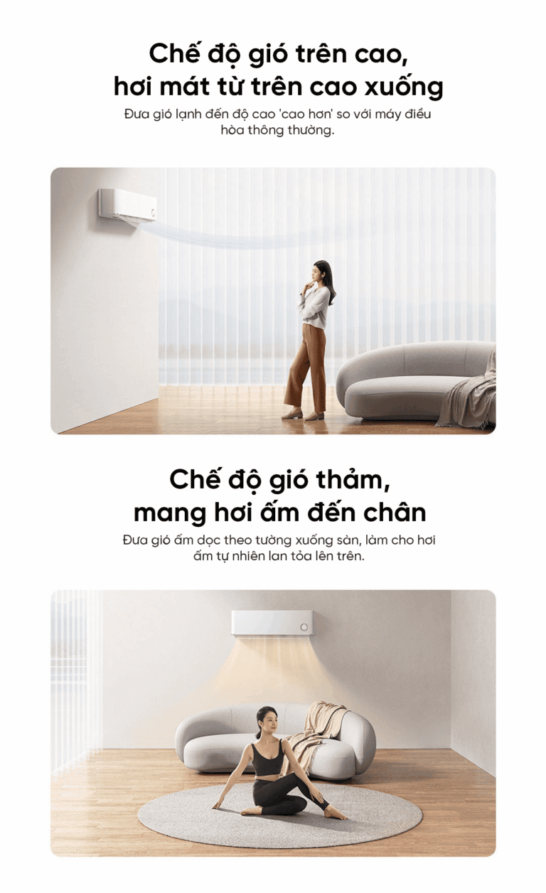 Chế độ gió trên cao giúp luồng không khí mát được thổi từ phía trên xuống, lan tỏa đều khắp không gian. Nhờ thiết kế đặc biệt, luồng gió được đẩy cao hơn so với các máy điều hòa thông thường, mang lại cảm giác mát dịu, tự nhiên và dễ chịu hơn mà không bị thổi trực tiếp vào người.